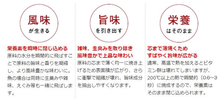 瞬間的に焼入れをしながら加圧する方法です。「瞬間」に加工することで旨味、栄養素を逃がしません。