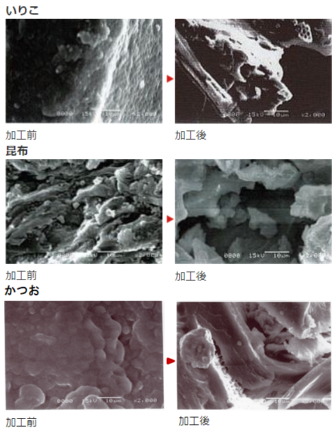 いりこと昆布の加工前・加工後の2000倍電子顕微鏡写真